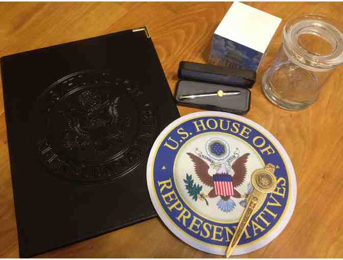 An executive desk set with items bearing the seal of the United State House of Represenatives. The set includes:
