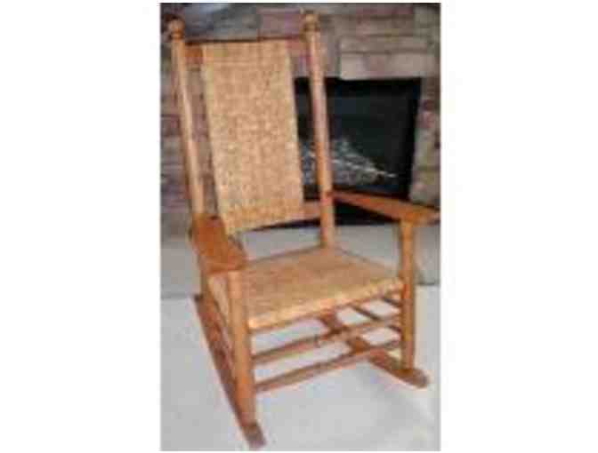 Kennedy Rocking Chair, donated by Spruce Mortgage. The Kennedy Rocking Chair is shaped, steam-bent and assembled while green according to the original design. There are no unnecessary frills -- every part is functional -- even the back post knobs have their use, as a place to tie a back cushion, if desired. The secret of this chair's comfort is the steam-bent curve of the back post, which sweeps in to give firm support to the sitter's back, and yet carry the weight down to the exact point on the rockers as they contact the floor.
