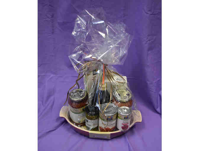 This Italian flair gift basket includes a certificate good for on Salud! cooking school class. Basket includes a LeCreuset stoneware casserole dish, pasta, sauces and pesto! Questo suona cosi bene!