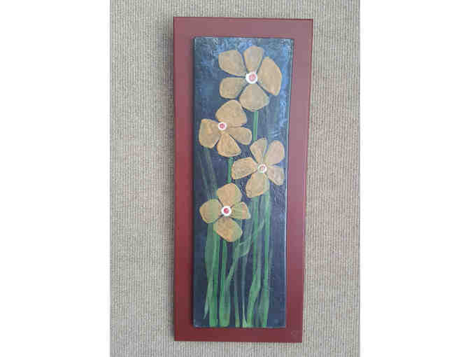 Yellow Flowers Raku Pottery Piece by Kevin Frazier. Ceramic portion measures 4.5"x13"; wood measures 6.75"x15"
