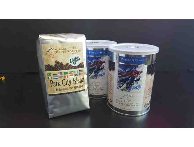 Two 12-ounce cans and one 12-ounce bag of whole bean coffee "Park City Blend" from Park City Coffee Roasters.