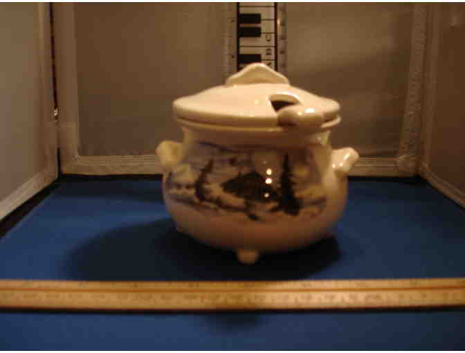 This delightful sugar bowl or jam jar has handpainted winter scenes of Anchor Point, Alaska on both sides of the bowl. 4 1/2" in diameter, stands 4" with covered top and spoon.