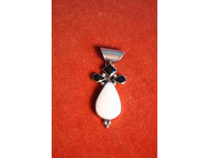 Add this elegant pendant to your collection: Set in silver with white (onyx?) and black (onyx?) stones.