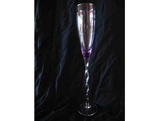 Lovely lilac hued 14 inch tall Italian fluted champagne glass with twisted stem, crafted by Tuscan designer, Amelia.