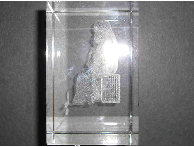 Solid crystal block with laser etched image of a mother holding a baby in one arm and her other arm around a toddler in the center. Below the design are the words: "Love and life start with mom"