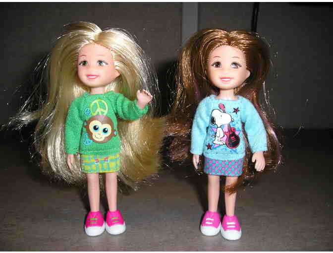 These dolls are sisters and best friends, dressed for school. 4 1/2" tall with moveable head, arms and legs.