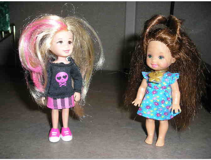 The two dolls are all dressed up and ready to go to a party. 4 1/2" tall with moveable head, arms and legs.