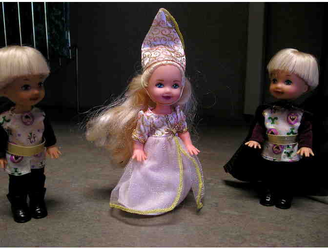 Pretty Princess doll all dressed in her finery with her twin brothers dressed in regal outfits. 4 1/2" tall with moveable head, arms and legs.