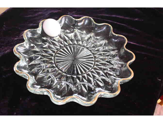 Serve your deviled egg appetizers in this gold-rimmed festive plate. 11 " diameter. Some wear on the gold rim.