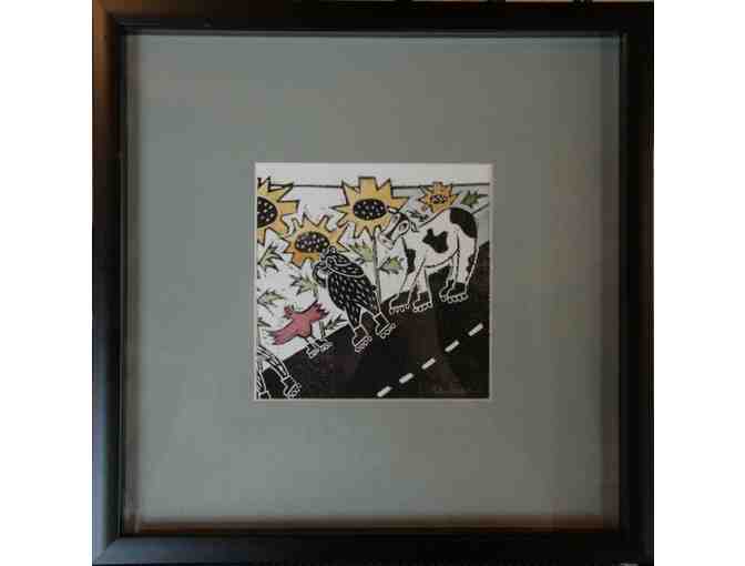 Kelly Dupre, a well-known local artist, illustrator, and former North House employee, crafted this whimsical linoleum block print. Using ink and watercolors, the print pictures farm animals rolling on rollerblades through sunflowers. The print is beautifully matted in a sage green and framed in black, measuring 13"x13". Kelly's work is featured in regional galleries and several published books. To learn more about her work, visit www.kellydupre.com.