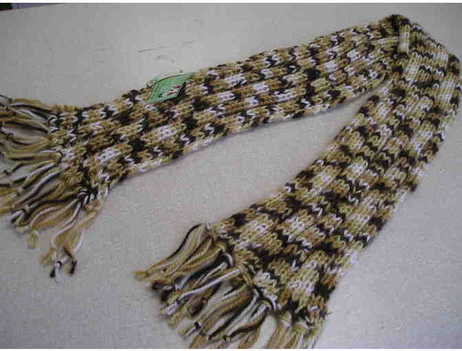 A Sumptuous Knit, brown, green and white hand-knit designer scarf by Joan Lopez & Laura Pessagno.