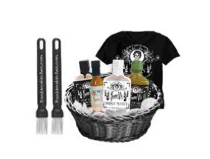 Includes: 1 Frankie V's Spooky White Hot Sauce, 1 Frankie V's Fiery White Hot Sauce, 1 Frankie V's Wasabi Green Thai Chili Hot Sauce, 1 Frankie V's Orange Label Hot Sauce, 1 Don't Get Scared Get Spooky Shirt and 2 Frankie V's Basting Brushes!