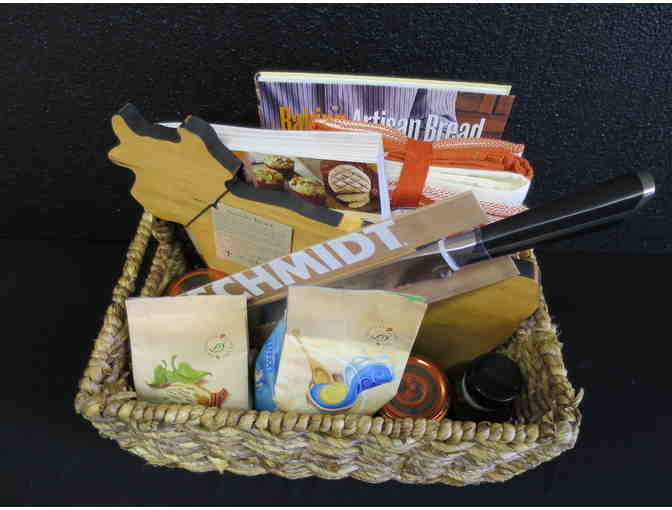 Everything you need to indulge in your daily carbs - German stainless steel 8" bread knife by Schmidt Bros, Cow shaped cutting board crafted in Vermont from North American Maple, four gourmet all-cotton kitchen towels and assorted jams and jellies to serve with your bread.