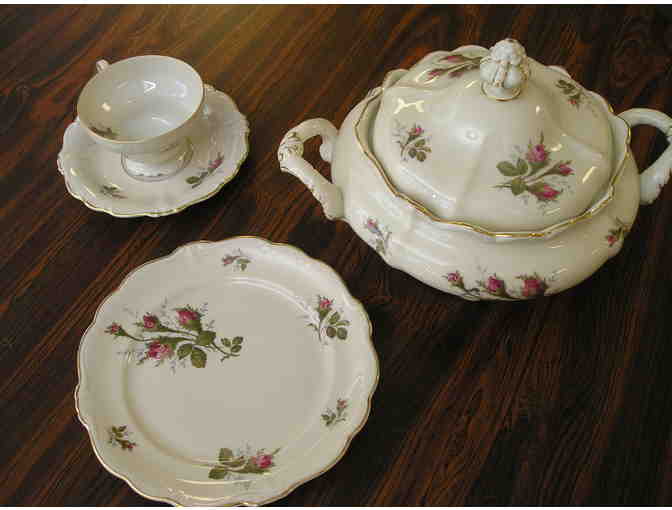 Lovely set is by Rosenthal, Selb-Germany. Pattern is Continental Moss Rose (Pomoadour, Ivory Body). Set includes: footed soup tureen with lid-7"height x 9" diameter; four (4) cups and saucers; four (4) plates; footed cream pitcher.