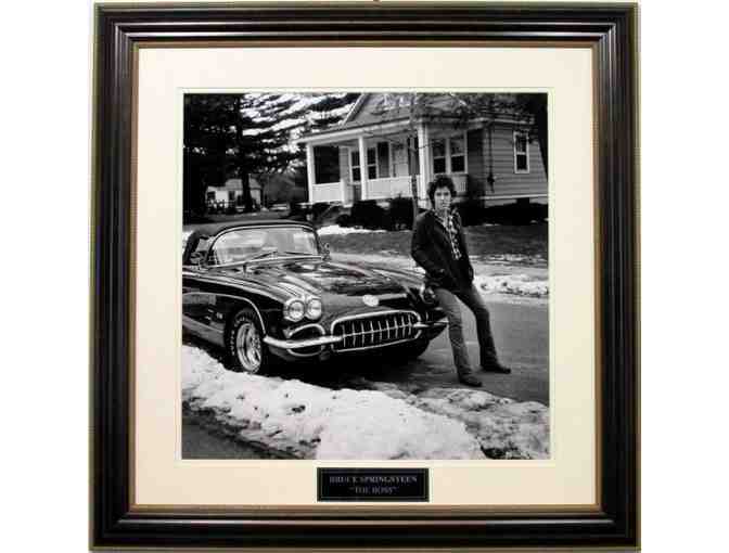 This incredible vintage 16x16 photograph of The Boss with his first Corvette, framed with a single white linen matte. This item measures 20x20.