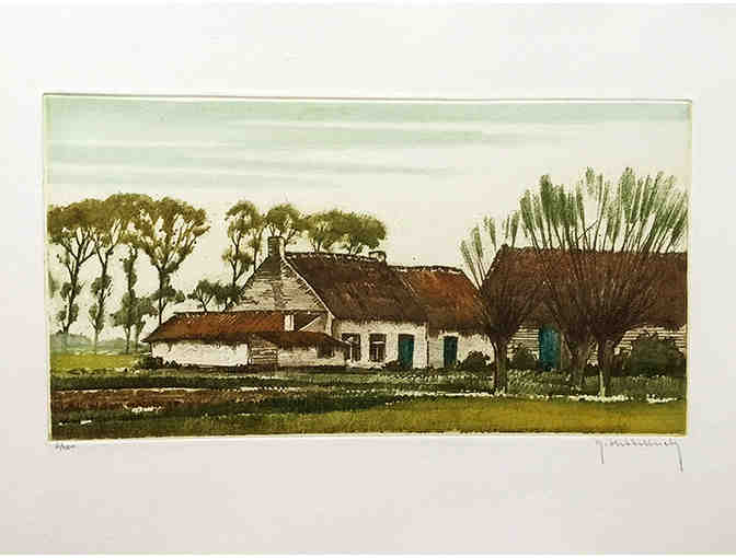 This original color etching measures 6 1/2" x 12" on a 12" x 17 1/2" sheet. This image was printed in an edition of 350 copies; this is copy number 5 and signed by the artist. The print comes unmatted and unframed.