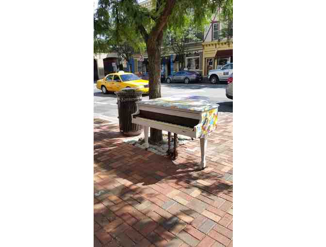 Playin’ Around South Orange was thrilled to have Lawrence Ciarallo back to paint another baby grand piano this year. Mac’s inspiration for his “portrait piano” is Malcolm John “Mac” Rebennack, a.k.a. Dr. John, an American singer-songwriter, guitarist, and most notably pianist. Best known for his combination of blues, jazz, pop, zydeco, boogie-woogie and rock and roll, Dr. John was a native of New Orleans whose work often featured references to the voodoo and Creole cultures. His portrait sits atop the piano lid surrounded by vibrant splashes of color and one token fluer de lis on the side. With a definite contemporary feel and celebratory air about it, this piano pays tribute to a great musician as it simultaneously lights up the town.