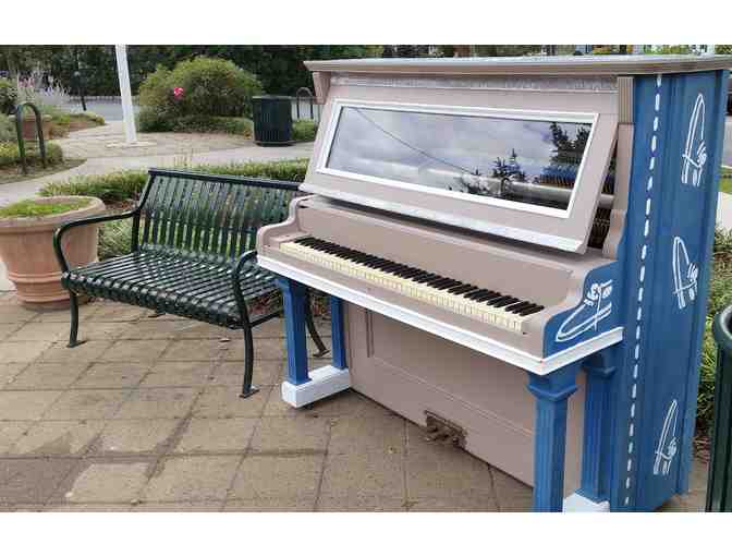 Artist Bill Billec’s mother was a shoe designer, so riffing on “Blue Suede Shoes” for his second painted SOPAC piano seemed to make sense on several levels. Something about the misspelling of “suede” in the original Carl Perkins’ lyric caught his eye (swade); and he went with it. Once deciding on his theme, Bill took it to the extreme of adding sawdust to his paint to recreate the visual texture of suede on part of the wooden surface of the piano, while attaching blue faux-suede to the back of the instrument to take the idea a step further. Upon opening the instrument, inside he found that the hammers which hit the strings and make the sound of each individual note actually look like little suede shoes. This “happy accident” led him to paint the wooden handles of the hammers blue and replace the front of the upright with a plexi-glass plate, so that people have a window into the upright’s inner workings; 88 tiny little “shoes” dancing around to make beautiful music!