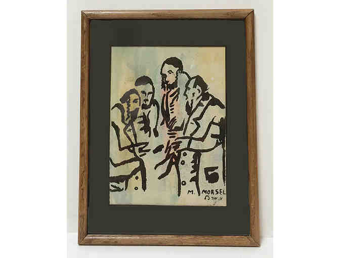 This Jewish-themed composition is an ink drawing on a watercolor background. The framed print measures 17 inches x 13 inches.
