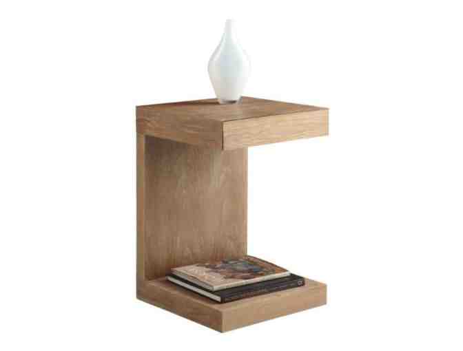 This simple but very functional c-shaped table with drawer can be used with a sofa, chair or even as a nightstand. Stocked in a new lightly distressed driftwood finish. Castors are included.