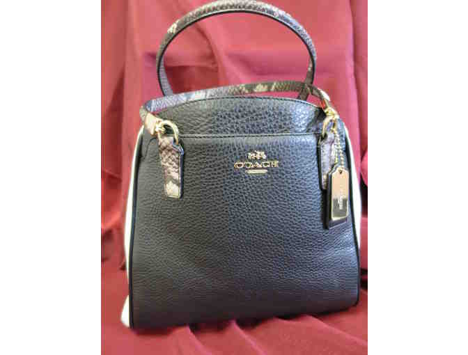The black/white/light gold Minetta crossbody can also be carried as a satchel. Crafted of pebble leather with python embossed trim. Has fabric lining, inside zipper, cell phone and multifunction pockets and snap closure. Handles with 5.5" drop.