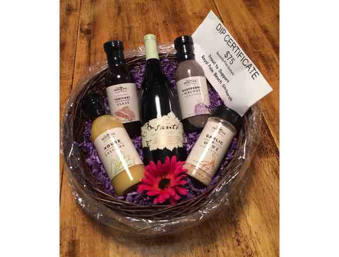 A Fondue Gift Basket includes a $75 Gift Certificate, Melting Pot House Dressing, Melting Pot Raspberry Walnut Vinaigette Dressing, Melting Pot Teriyaki Glaze Sauce, a Bottle of Wine and Melting Pot Garlic and Wine Seasoning!
