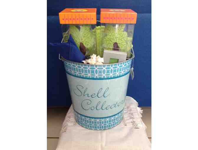Bucket full of 2 wine glasses, 2 placemats, 2 cloth napkins, 2 napkin rings, and a paper weight. Includes a $25 gift certificate to the Jolly Pelican, an Islamorada boutique for clothing, decor, and home decor.