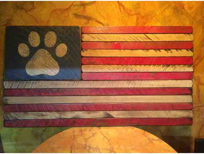 The high bidder on this item receives a wooden American flag with a pawprint, handcrafted by Rustic Marlin Designs. Rustic Marlin Designs handcrafts wooden furniture, decor and signs. All items are proudly made in the USA.