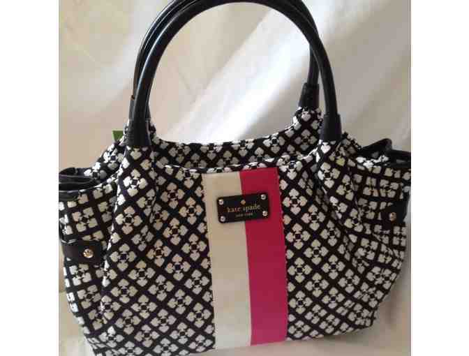 Beautiful and roomy Kate Spade fabric purse, featuring black and white design with cream and pink accent stripes. Approx 15" in length.