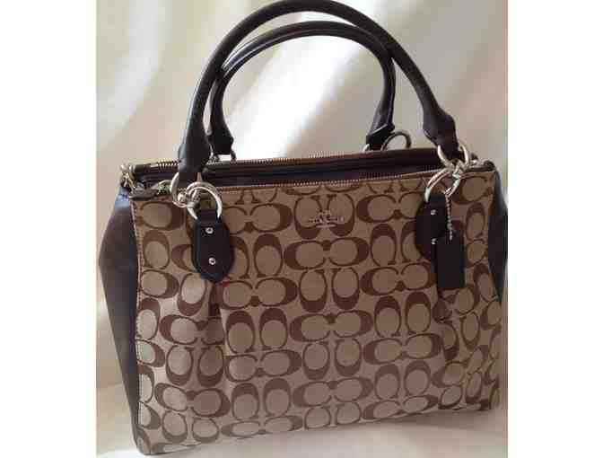 Gorgeous brown leather Coach purse featuring Coach's signature fabric. Great for work or play. Approx 14" in length.