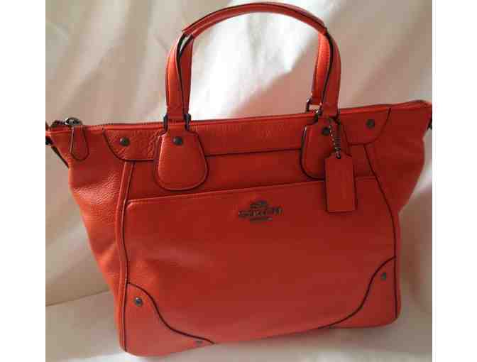 Gorgeous orange leather Coach handbag. The hot new color for fall, this handbag goes with almost any color and offers the perfect pop to any outfit. Includes optional shoulder strap. Approximately 15" in length.