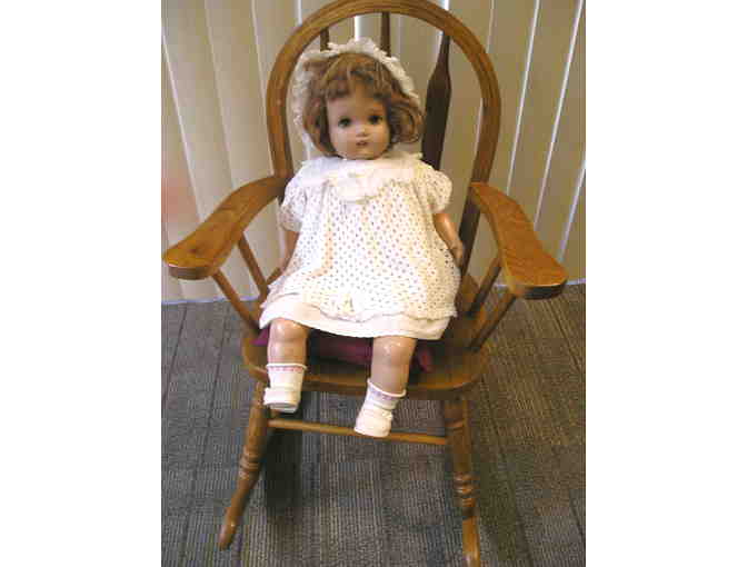 This darling vintage composit doll has a cloth body with original clothes. Her eyes open and shut and she has painted eyebrows and lips. She has two teeth. Probably from the 1930-1940 period. In very good condition.