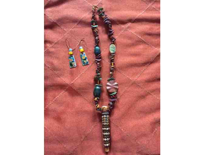 Necklace: The focal pendant is handmade / human-made resin. The beads which surround the pendant are a wide variety of earthy beads, including real Mookaite gemstone chips, flat carved Mookaite disc, a light washed turquoise scarab, vibrant blue stone tube beads, brown glass beads, and deep purple and aqua curved beads. The toggle/ hook clasp is handmade and has a matching brown glass bead used within the necklace.