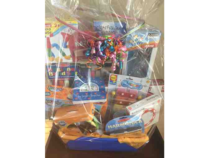 Looking for the perfect gift for a child. This basket is full of fun books musical toys that will keep your 2-4 year old entertained for hours. There is even a pair of headphones for you in case the cacaphony gets too much.