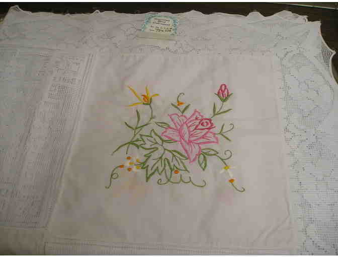 Absolutely beautiful hand sewn tablecloth in squares of lace and squares of embroidery. Also includes eight large napkins. Tablecloth measures 72 x 108.