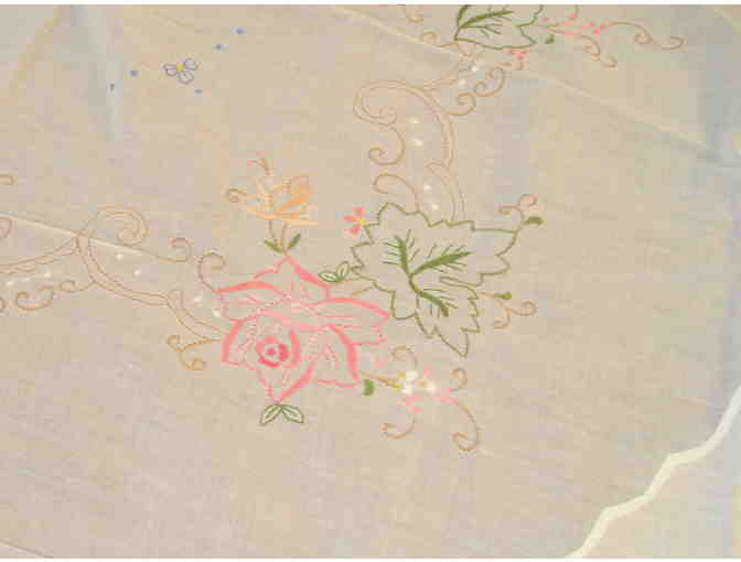 Very lovely hand made tablecloth and napkins embroidered with a beautiful floral design. Sure to grace your table. 64" round with eight (8) embroidered napkins.