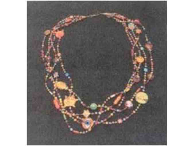 30" three-strand braided necklace. This necklace is a riot of color. You can't have a bad day when you're surrounded by an eclectic mix of smiling fish, bunnies, dogs, pigs, smiley faces, sunbursts and "good luck" charms. Gold tone cone end caps and vermeil "S" clasp.