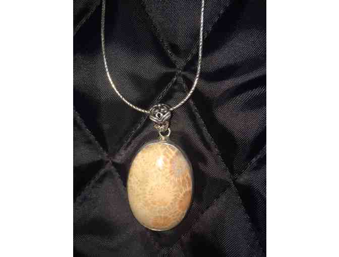 Beautiful fossilized coral pendant on a 16" sterling silver chain. Hues of ivory, cream, ecru and gray make this piece very soothing to look at.