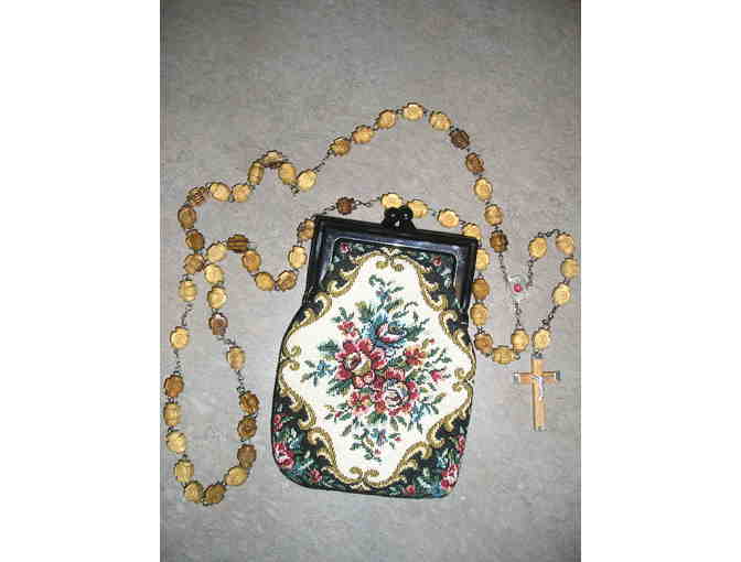 Rosary beads are olive wood carved from Jerusalem. The tapestry purse is 6" high x 4" wide. Tapestry is on the front. The back is black.