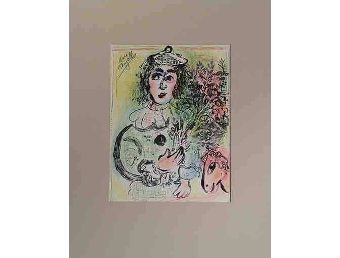 A matted print (unframed) by Marc Chagall (Russia 1887-1985 France). Clown with flowers (M. 399). Original color lithograph, 1963. 40 signed & numbered + c. 2000 unsigned impressions for Chagall Lithographe II. Illustrated in the 1988 Moscow Chagall Exhibition. Image size: 320x240mm.