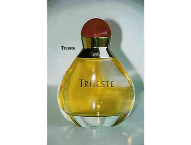 Own a true collector’s item: Trueste by Tiffany. This heavy glass bottle stands 12" tall X 8" wide.The stopper is deep red with a gold band around the neck embossed "Tifany." It contains original liquid and is marked "Trueste" across the front in black letters.