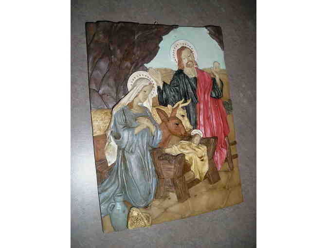 This Holy Family relief polyresin wall plaque measures 8"high x 6" wide.