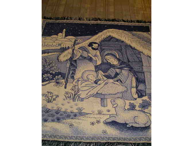 Cotton throw blanket with a Nativity scene and Bethlehem.