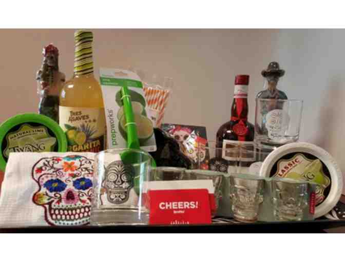 This Day of the Dead-themed margarita basket is perfect for Dia de los Muertos, Cinco de Mayo or Tequila Tuesday. Included: four themed shot glasses, margarita mix, lime squeezer, two containers of salt, decorative bowl, patterned napkins, four sugar skull tumblers, embroidered bar towel, colorful straws and a wickedly awesome serving tray. Also included is a $25 BevMo gift card.