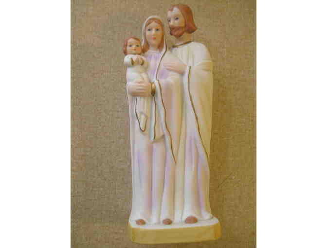 This statuette was made in Japan by Sanmyro. Vintage figurine of Joseph and the Virgin Mary holding Baby Jesus. 8 1/2" high