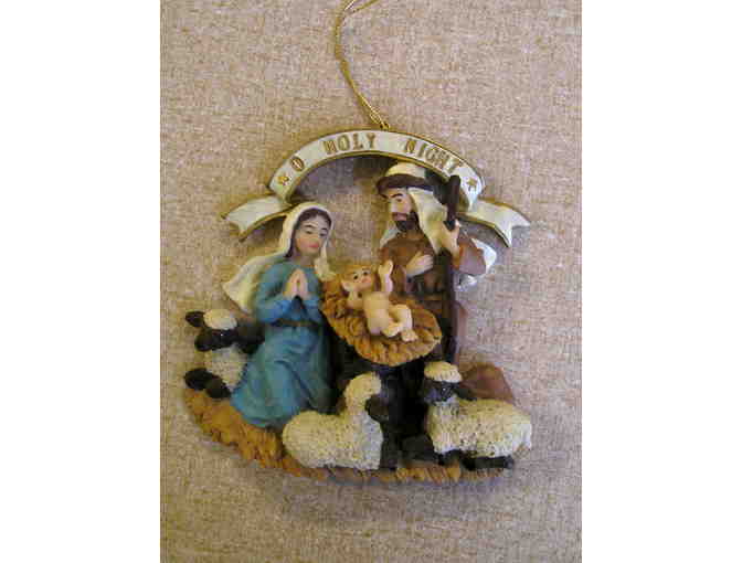 Nativity figures are detailed beautifully. The white banner overhead is trimmed in gold as well as the words "O Holy Night." Three sheep under baby Jesus' feet. 4-1/2"