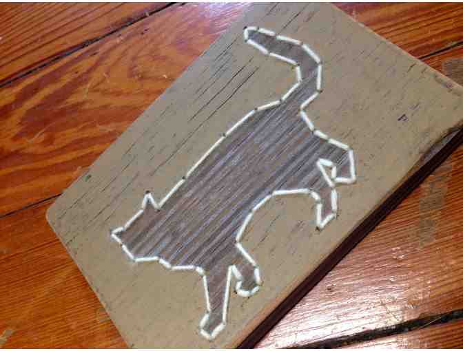 Reclaimed wood with brown background and a cat embroidered in white yarn.