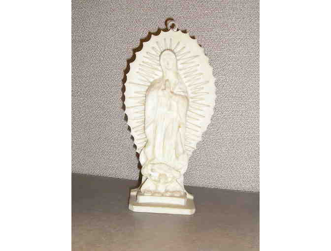 This very unique wall decor of Our Lady of Guadalupe is made from a high quality white marble composite material. It has been designed from Master Italian Artisans with the superb attention to detail. The wall plaque features a beautiful image of Our Lady with her eyes gently closed and her hands folded in prayer. She is being held by an angel cherub and she is outlined in heavely rays of light. Suitable for indoor or outdoor use. 8 1/2"