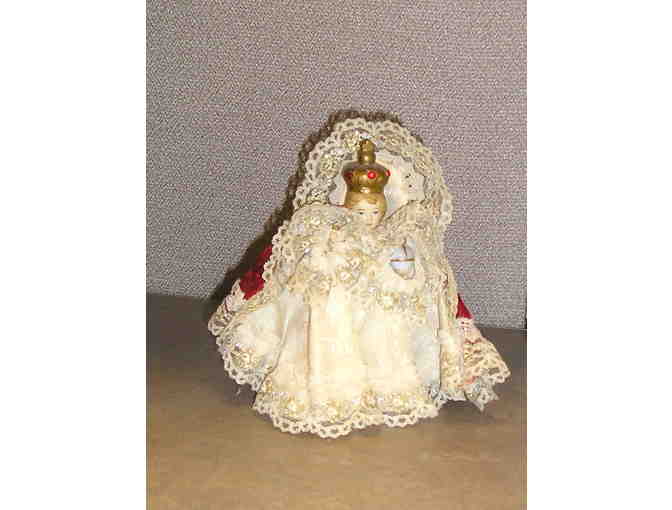Infant of Prague statue is dressed in lace and garnet colored cape trimmed with lace. Three garnet stones are on the front of the crown. 6" high