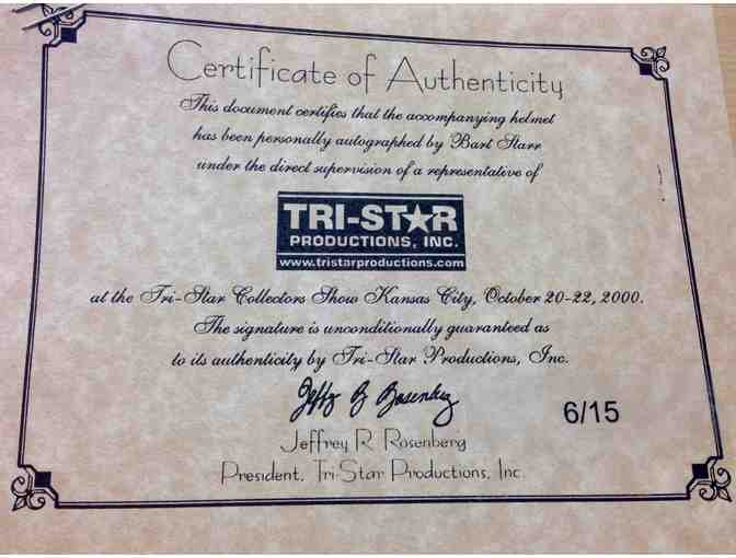 Official NFL helmet, autographed by Hall of Fame Packers legend, Bart Starr. Helmet is full-size Pro Line by Riddel. Limited edition, numbered 6 of 15. Helmet has limited edition hall of fame decal.